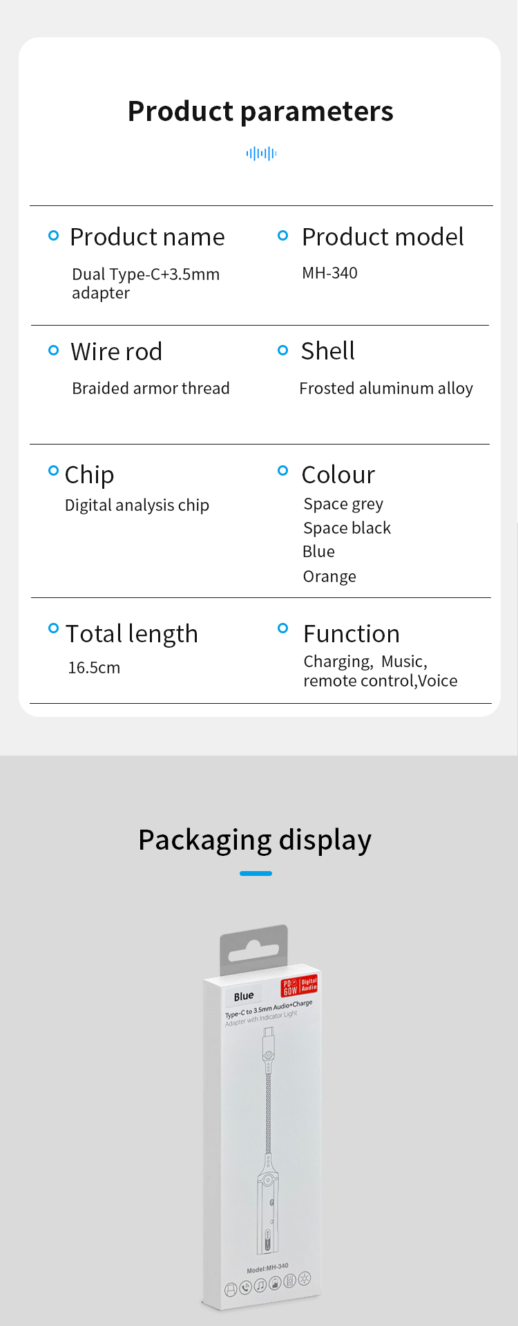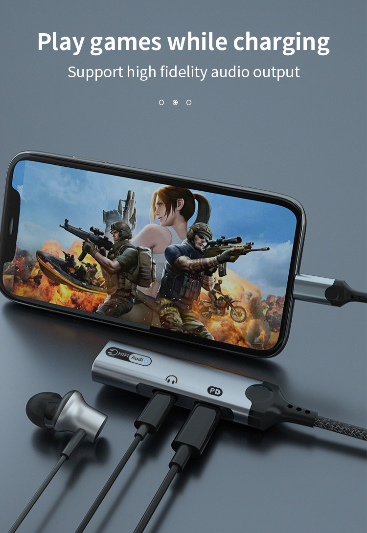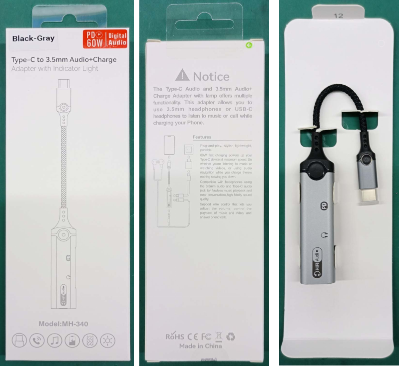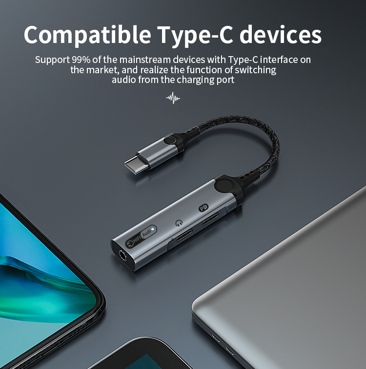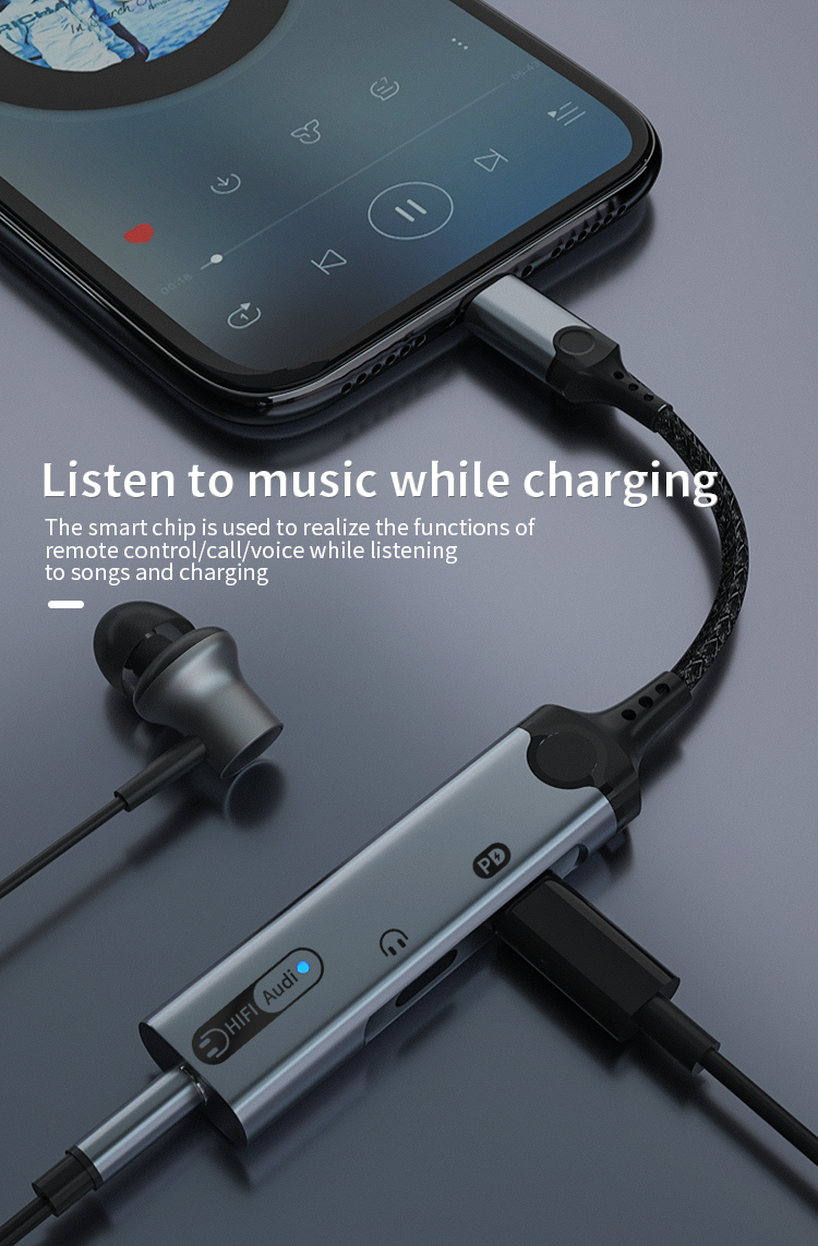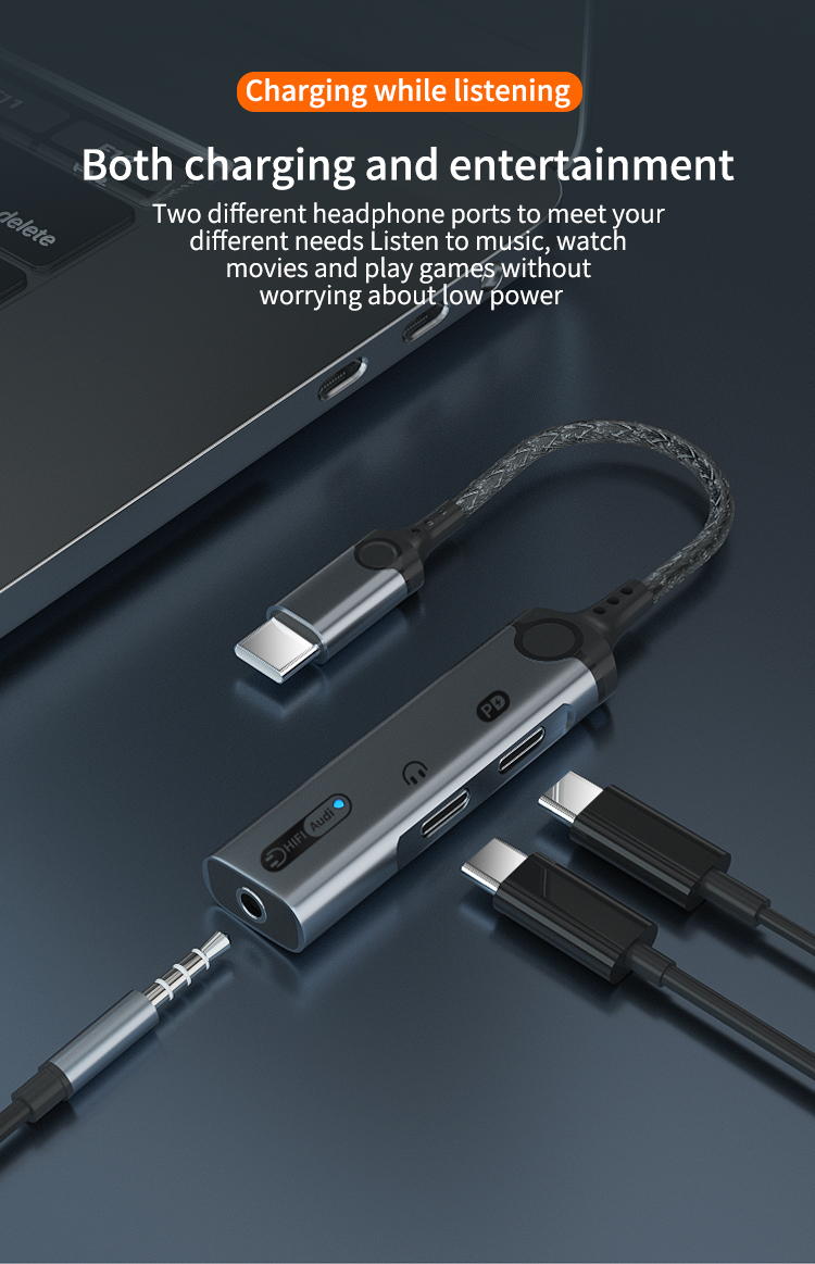 1. Size: 180mm 2. Type-C to Type-C+3.5mm+Type -C audio adapter 3. Wire: 3.5mm braided armor wire 4. Shell: aluminum alloy shell 5. Power: 60W 6. Working indicator: blue 7. Chip: Realtek 5686