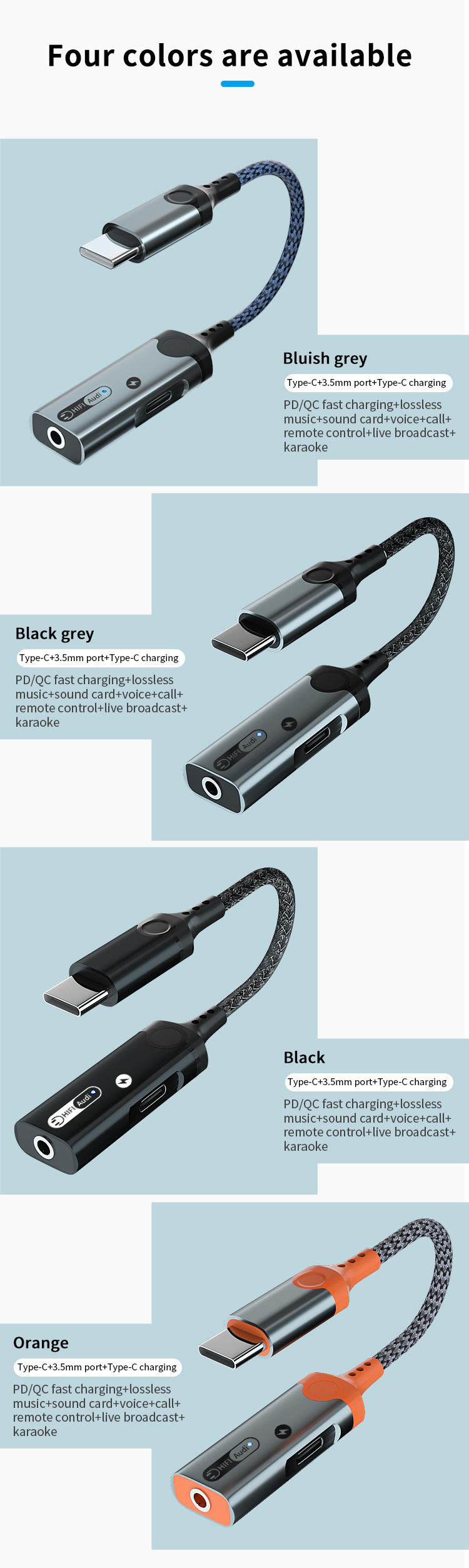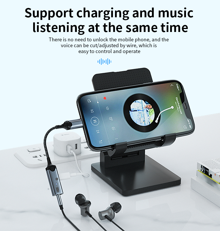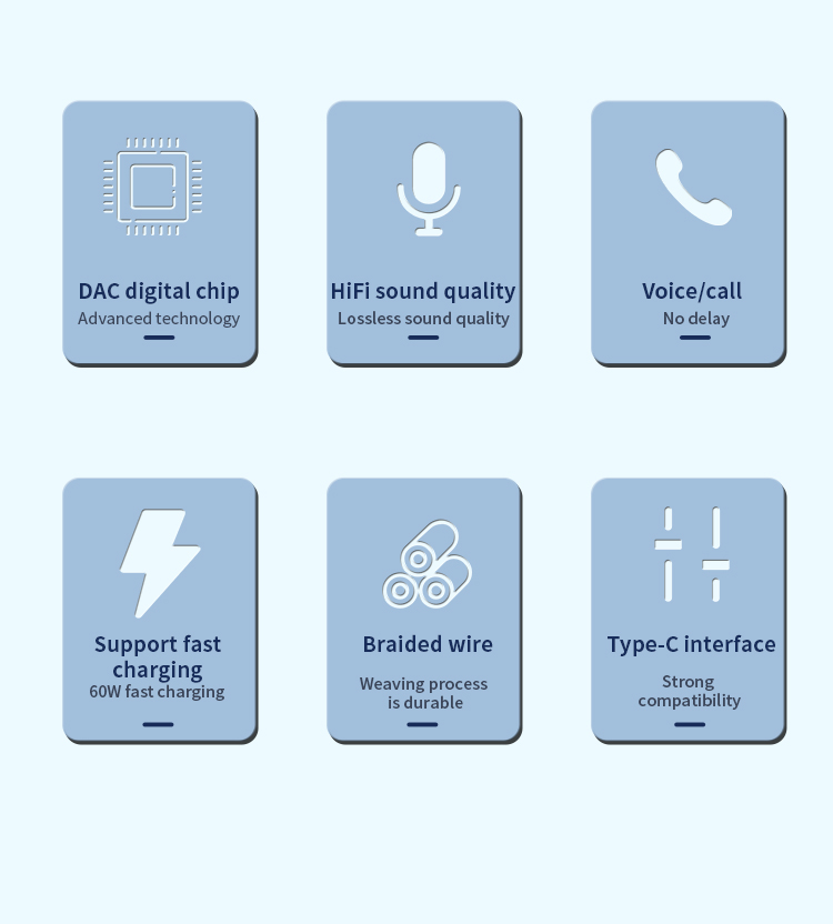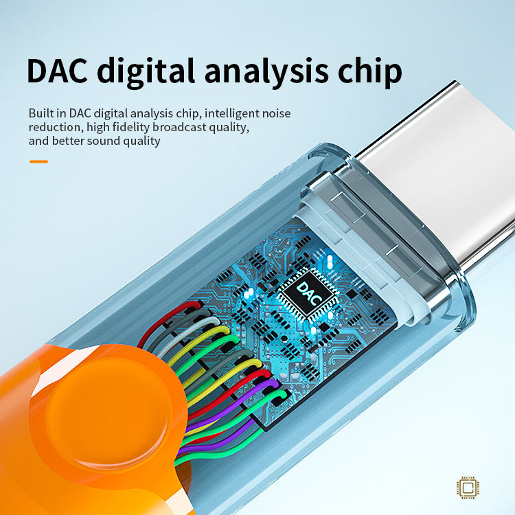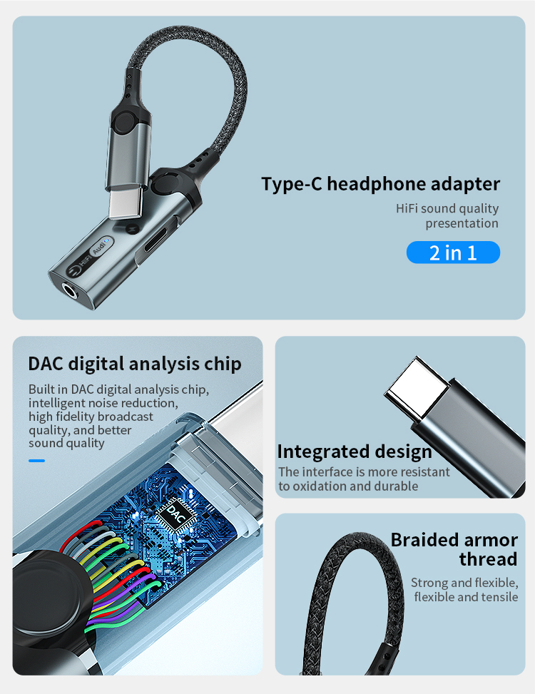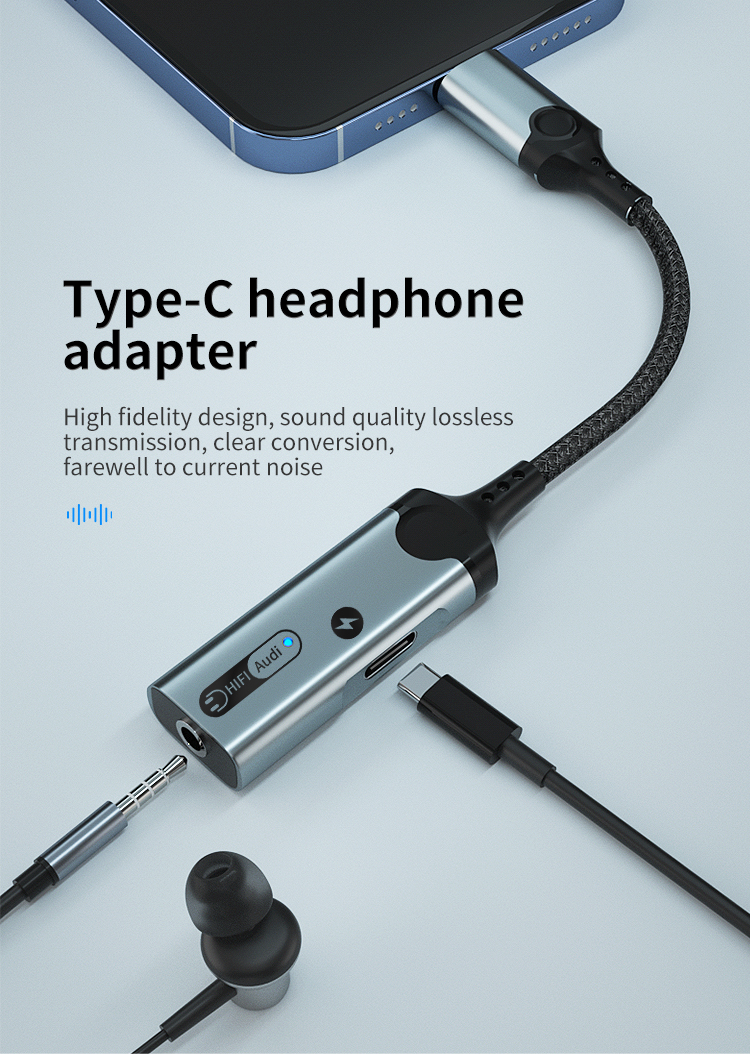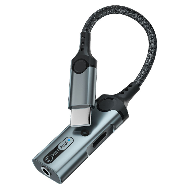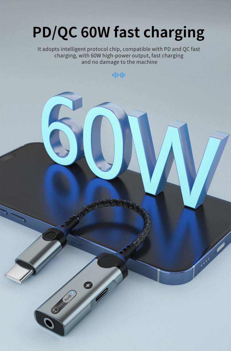 1. Size: 160mm 2. Type-C to 3.5mm+Type -C audio adapter3. Wire: 3.5mm braided armor wire 4. Shell: aluminum alloy shell 5. Power: 60W 6. Working indicator light: blue 7. Chip: Realtek 56868. Product model: MH-341