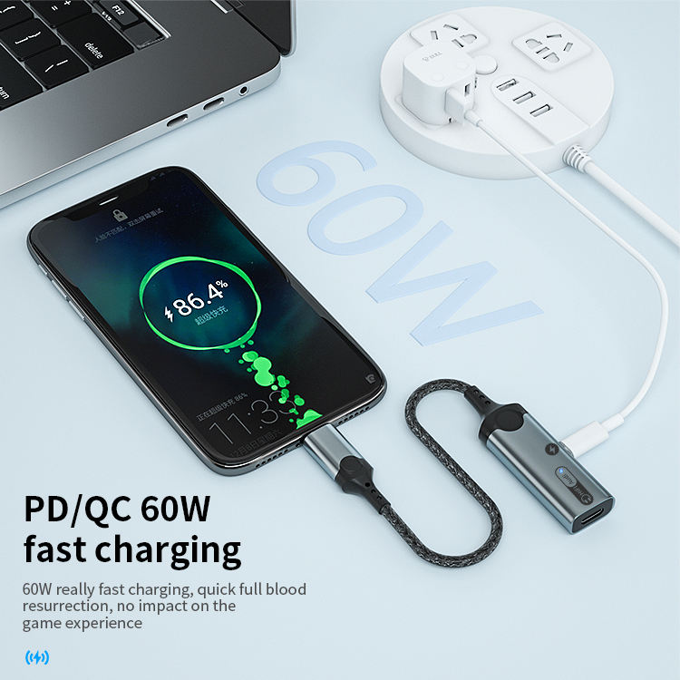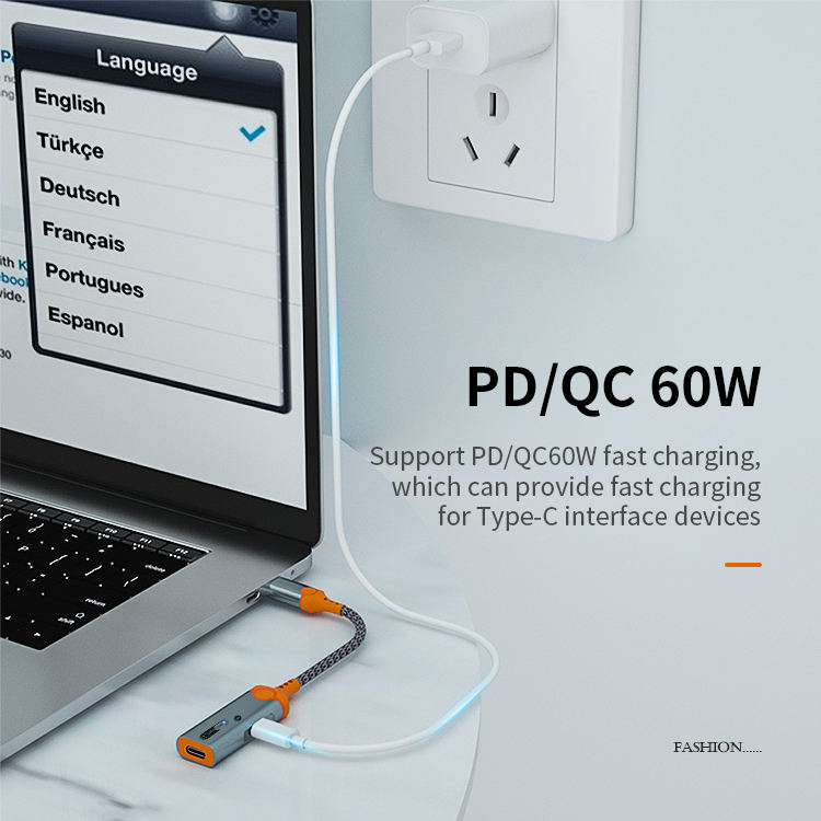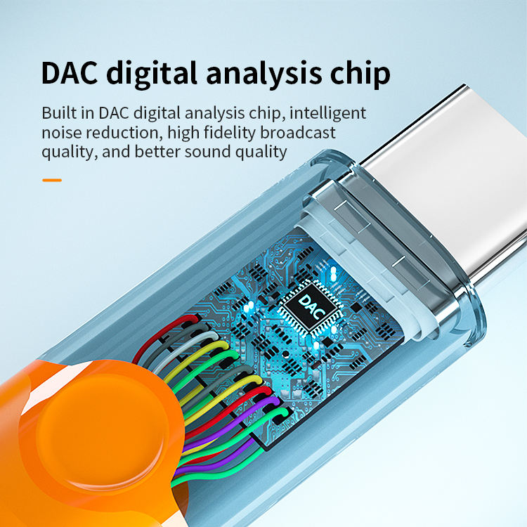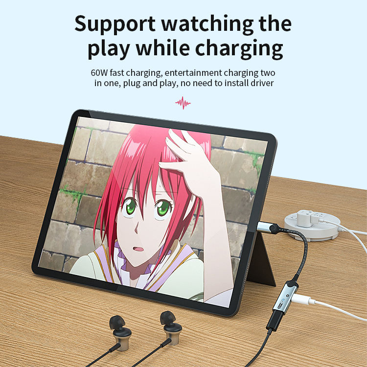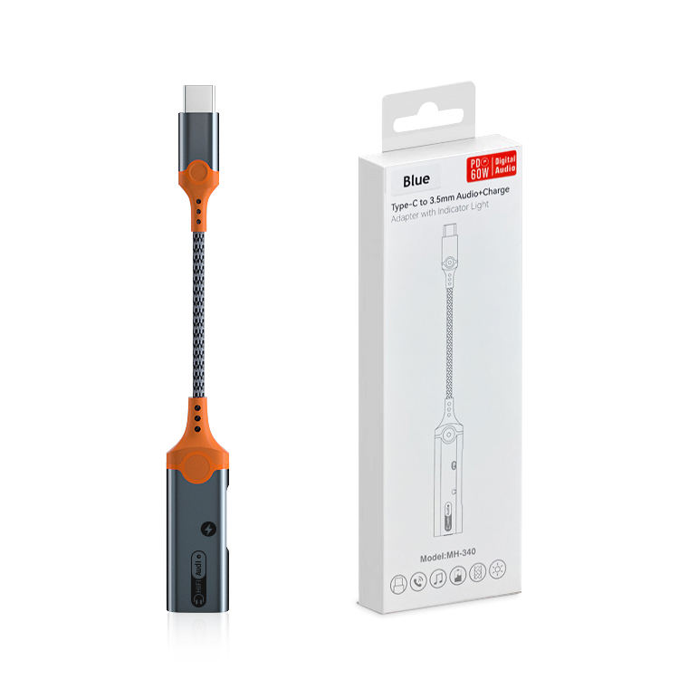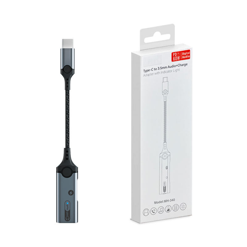 1. Size: 160mm 2. Type-C to dual Type -C audio adapter3. Wire: 3.5mm braided armor wire 4. Shell: aluminum alloy shell 5. Power: 60W 6. Working indicator light: blue 7. Chip: Realtek 56868. Product model: MH-341